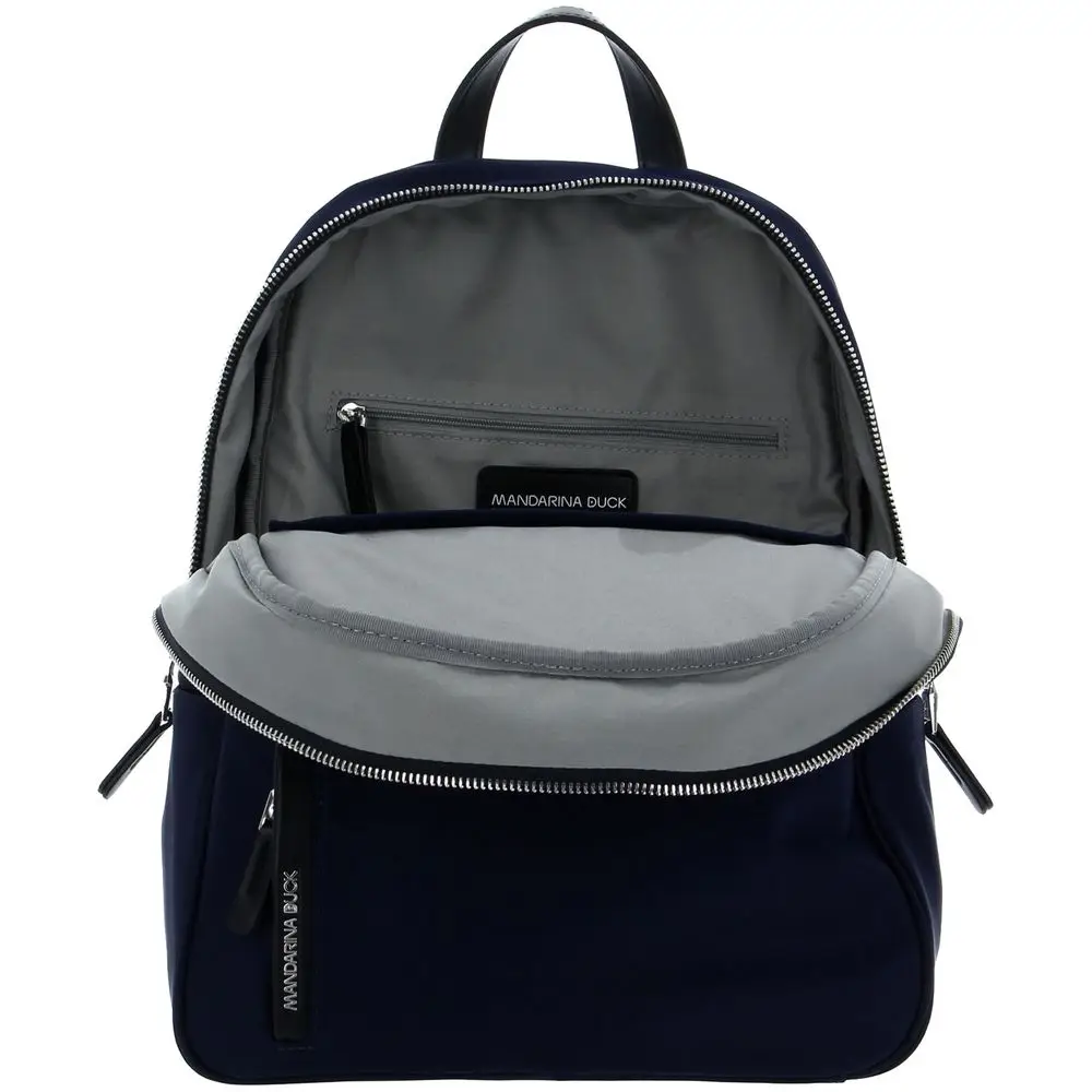 Изготовлен из гладкого влагостойкого нейлона, а также дополнен привлекательной фурнитурой из экокожи и металлизированным логотипом бренда.