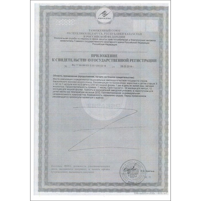 Способ применения: взрослым и детям старше 3-х лет по 1 капсуле 1 раз в день во время еды, запивая жидкостью.