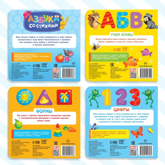 Набор картонных книг познакомит ребёнка с алфавитом, формами и цифрами.