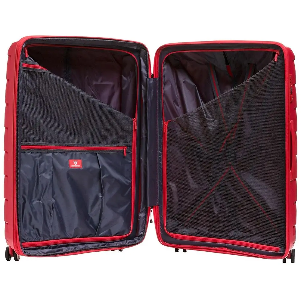- Чемодан с 2 отделениями: одно из них с фиксирующими ремнями и сетчатой шторкой на молнии, второе — с разделителем на молнии