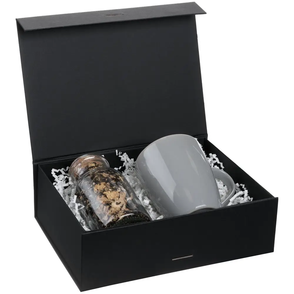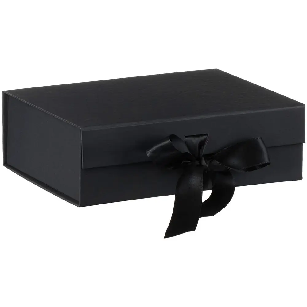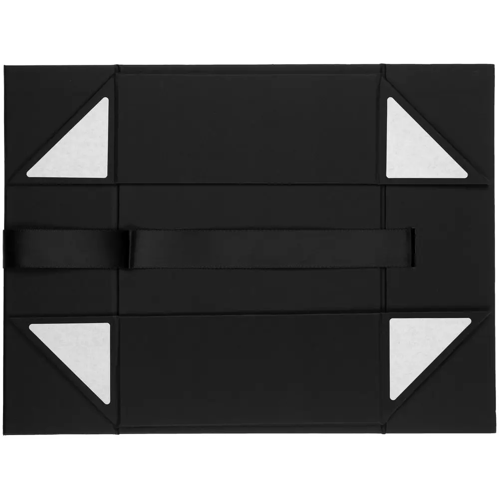 Коробка из переплетного картона, кашированного тонированной в массе крафтовой бумагой. Крышка на двух магнитах дополнительно фиксируется репсовой лентой.Толщина картона 2 мм.