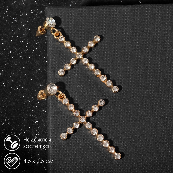 Серьги со стразами «Крестики» с делениями, цвет белый в золоте