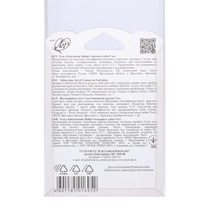 Гель с блёстками "Луч", 5 цветов х 5 мл, "Блеск"
