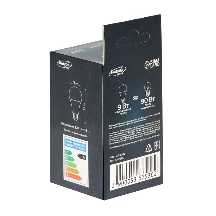 Лампа cветодиодная Luazon Lighting, A55, 9 Вт, E27, 780 Лм, 4000 К, дневной свет