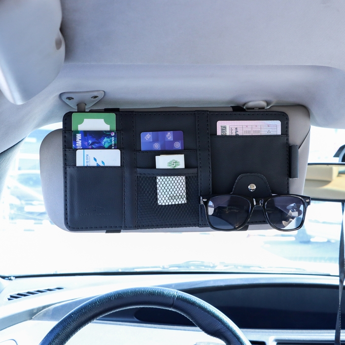 Органайзер на козырёк автомобиля поможет поддержать порядок в машине и при этом всегда иметь все необходимое под рукой! Панель органайзера оснащена кармашками для банковских, визитных карточек и других ценных предметов небольшого размера, так же имеется держатель для ручки и очков. Прикрепляется органайзер на солнцезащитный козырек двумя резинками.