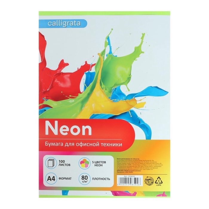 Бумага цветная А4, 100 листов, неоновая, 5 цветов, 80г/м2