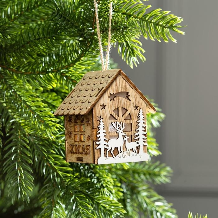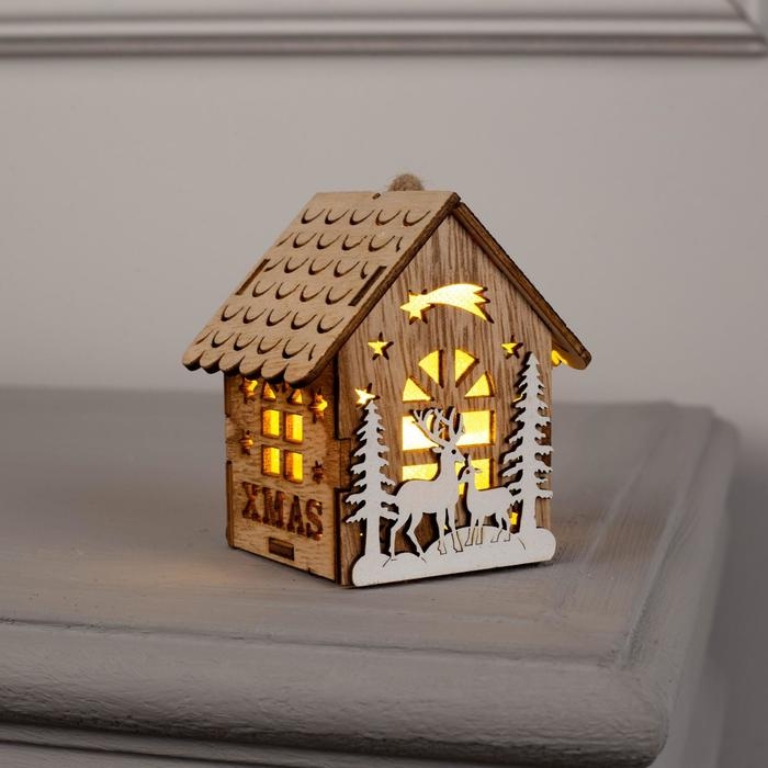 Ёлочная игрушка «Домик с оленями», от батареек, свечение тёплое белое