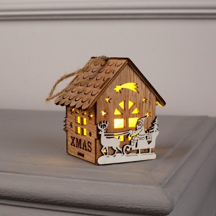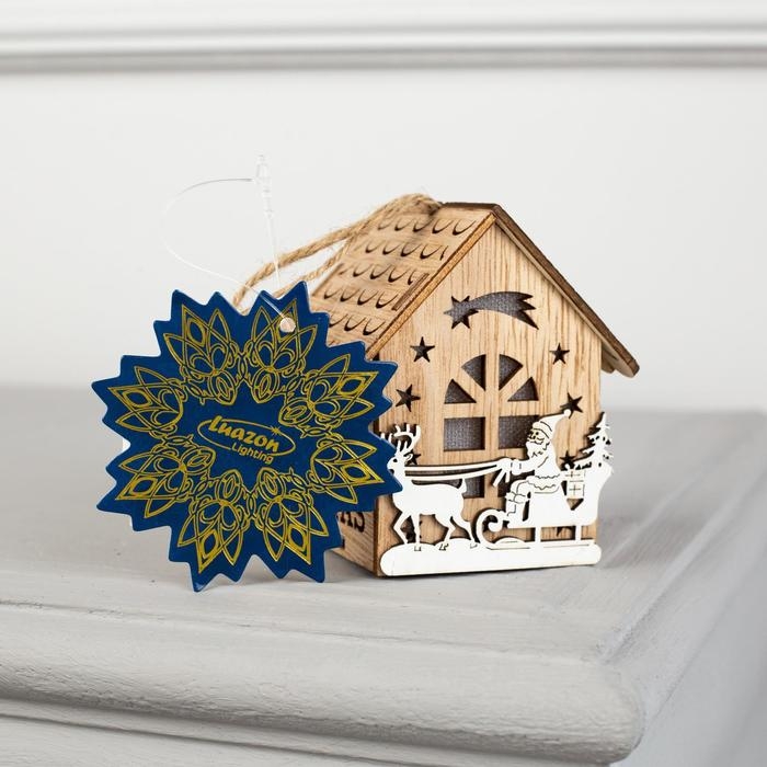 Ёлочная игрушка «Домик с Дедом Морозом на санках», от батареек, свечение тёплое белое