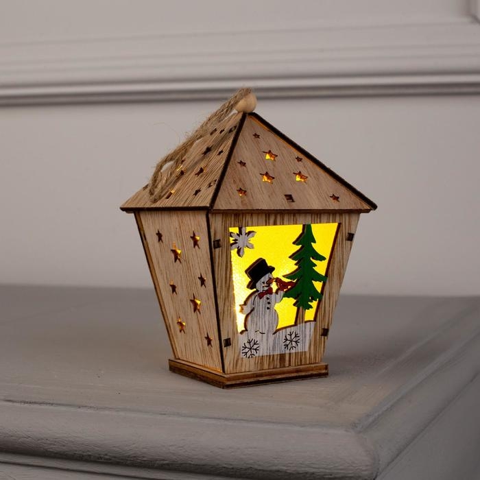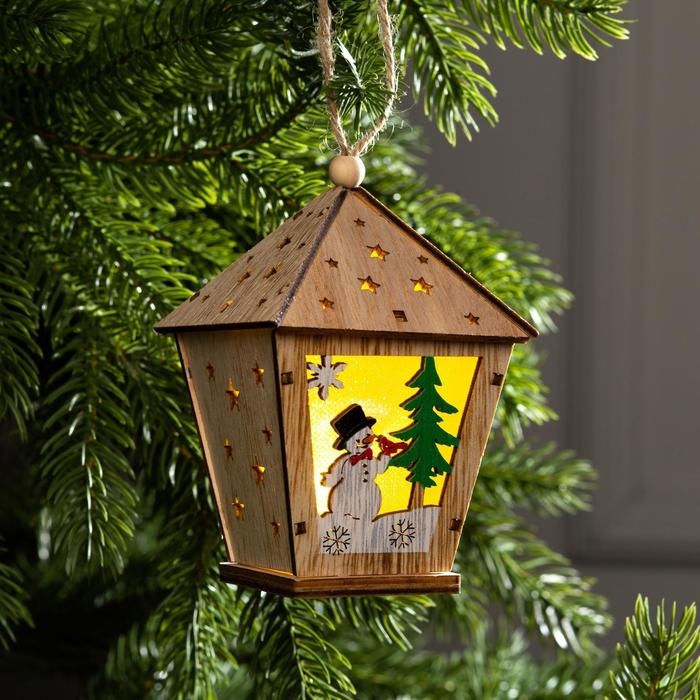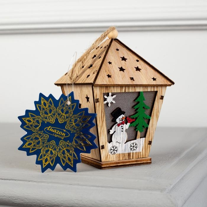 Ёлочная игрушка «Фонарь со снеговиком», от батареек, свечение тёплое белое