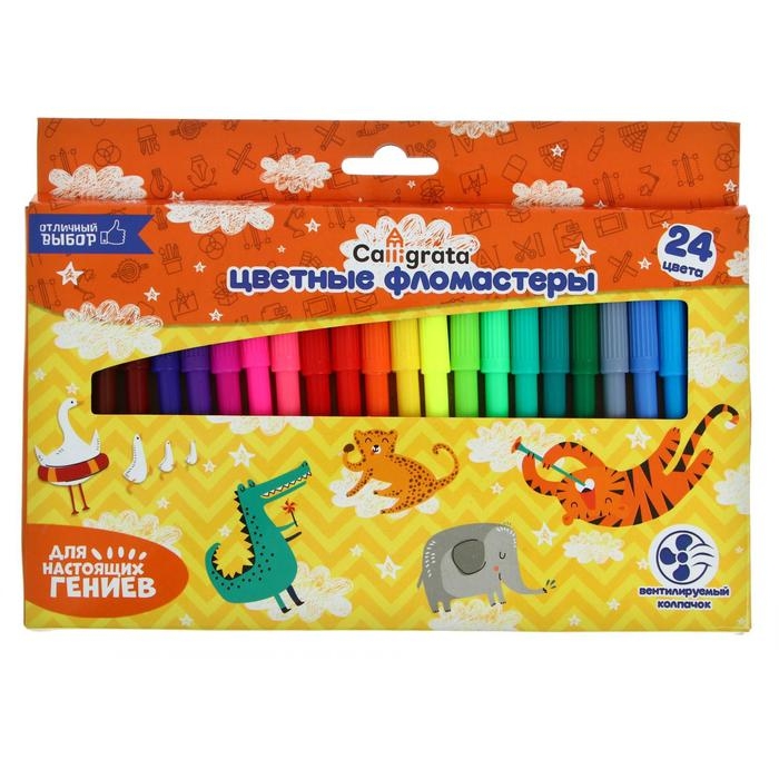 Набор фломастеров Calligrata содержит 24 ярких и насыщенных цвета. Вентилируемый колпачок обеспечивает безопасное рисование для ребенка . Идеально подходят для детей от 3-х лет и для тех, кто только начинает свой творческий путь. Фломастеры состоят из пластика, чернил. Упаковка представлена в виде цветной картонной коробки. Благодаря фломастерам Calligrata Вы сможете воплотить все свои творческие фантазии в реальность.
