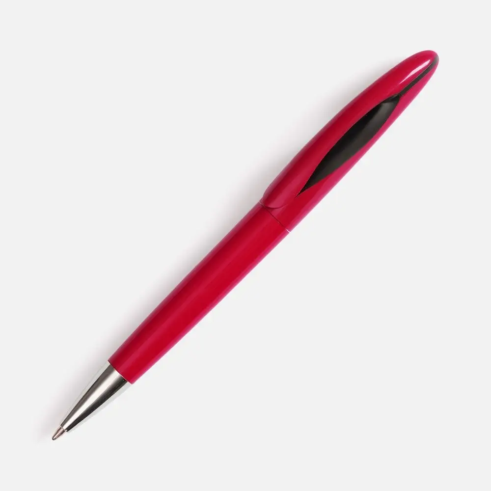 Шариковая ручка приятных округлых форм с цветным глянцевым корпусом и черным акцентом.