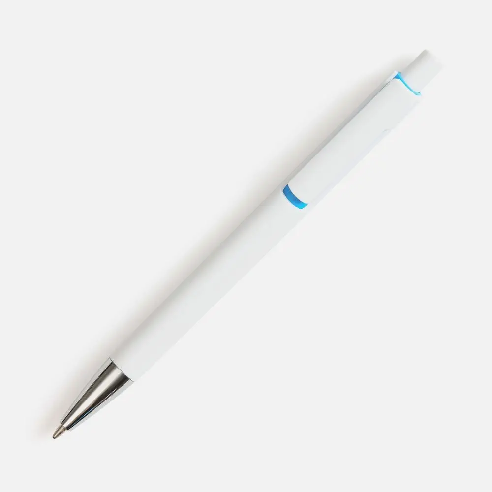 Шариковая ручка с глянцевым белым корпусом и цветовым акцентом у клипа, который дополнит логотип компании.