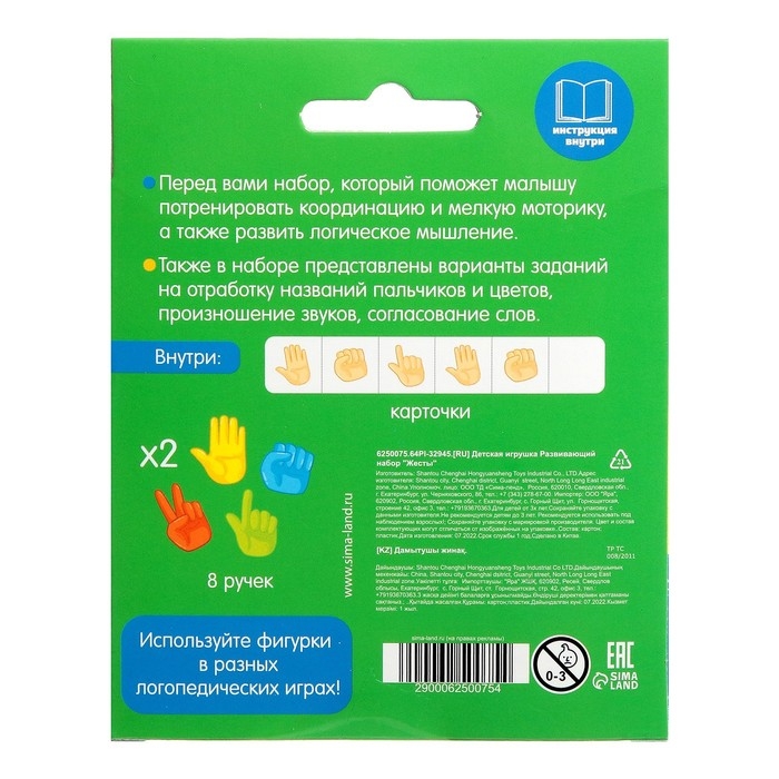 Инструкция с правилами игры представлена внутри набора. Фантазируйте и придумывайте свои задания для крохи. Используйте фигурки жестов и в других логопедических играх!