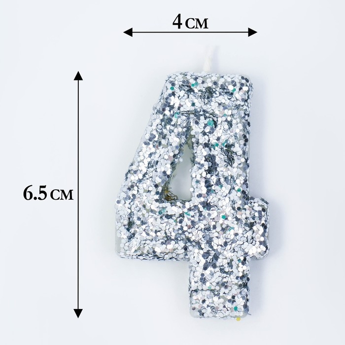 Свеча в торт «Блестки», цифра "4", серебро, 6.5х4