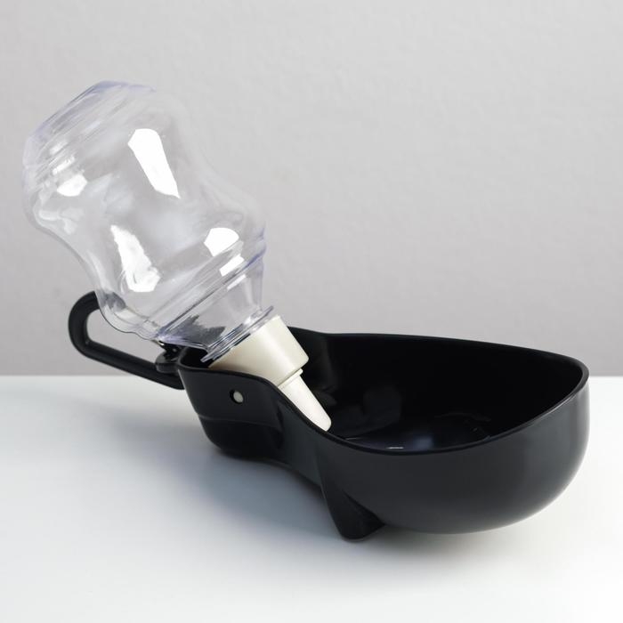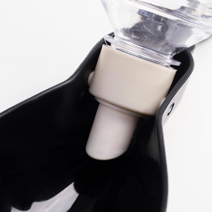 Бутылка для собак проста в использовании. Бутылка для собак откручивается от лотка, наполняется водой, затем снова прикручивается. Далее для поступления необходимого количества воды нужно нажать на бутылку и вода поступит в контейнер для питья собаки. В вертикальном положении поилка не протекает.