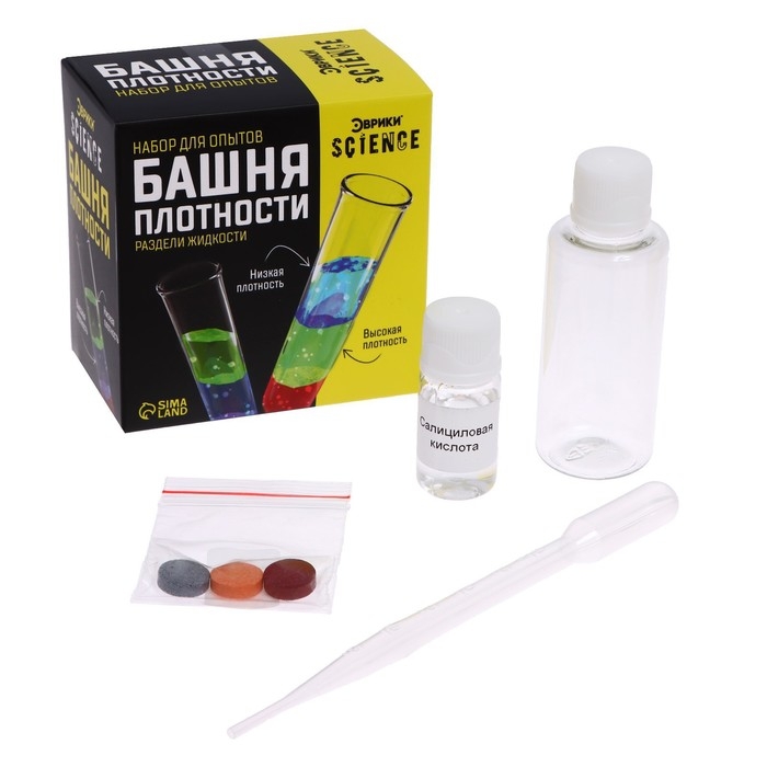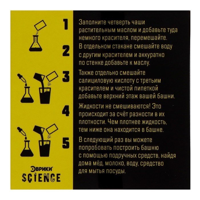 Опыт «Башня плотности» демонстрирует способность жидкостей не смешиваться при различной плотности. Вещества с меньшей плотностью оказываются на поверхности более плотных веществ.