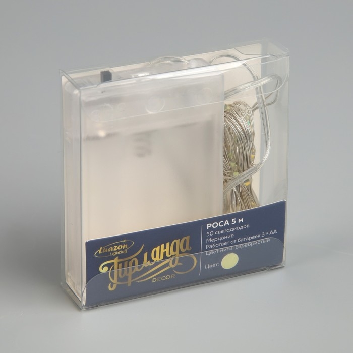 Гирлянда «Нить» 5 м роса, IP20, серебристая нить, 50 LED, мерцание белым, батарейки AAх3 (нет в комплекте), свечение тёплое белое