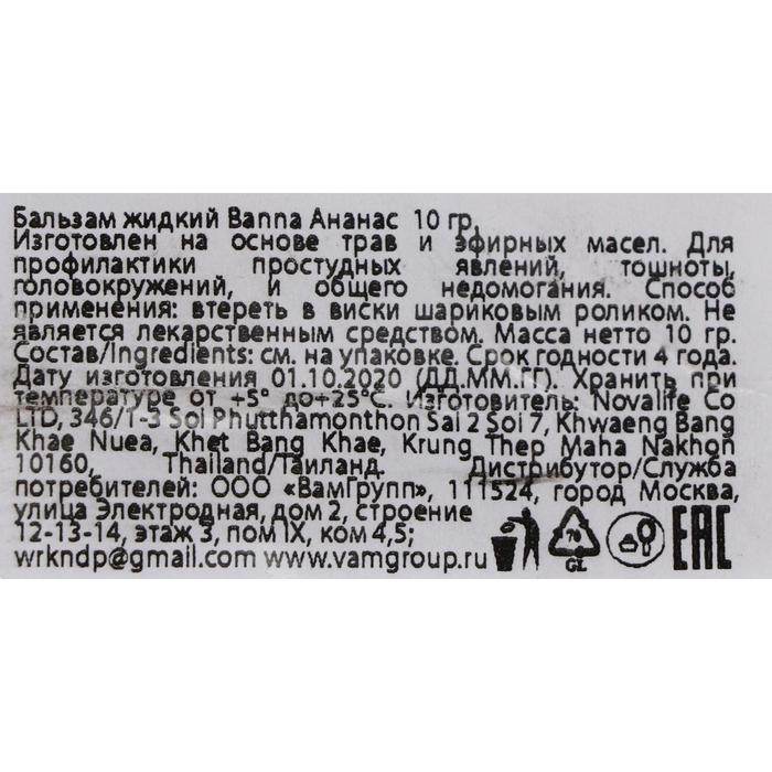 Бальзам жидкий Banna Oil Balm with Herb Pineapple с экстрактом ананаса от головной боли и тошноты, 10 г
