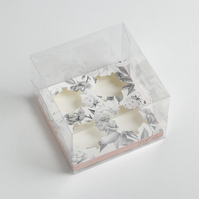 Коробка для 4 капкейка с прозрачной крышкой, "Тюльпаны", 16 × 16 × 10 см, кондитерская упаковка
