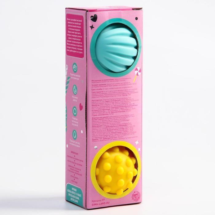 Мячики с рельефной массажной поверхностью способствуют развитию мелкой моторики и тактильных ощущений. Давление на фактурную поверхность мячиков стимулирует и благоприятно воздействует на нервные окончания, ответственные за большинство процессов в организме. Шарики имеют яркие цвета, которые способствуют развитию зрения, а пищалка внутри развивает слуховое восприятие.