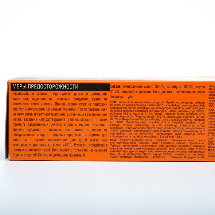 Состав: минеральное масло 39,0%, полибутен 36,5%, каучук 21,0%, пищевой аттрактант.