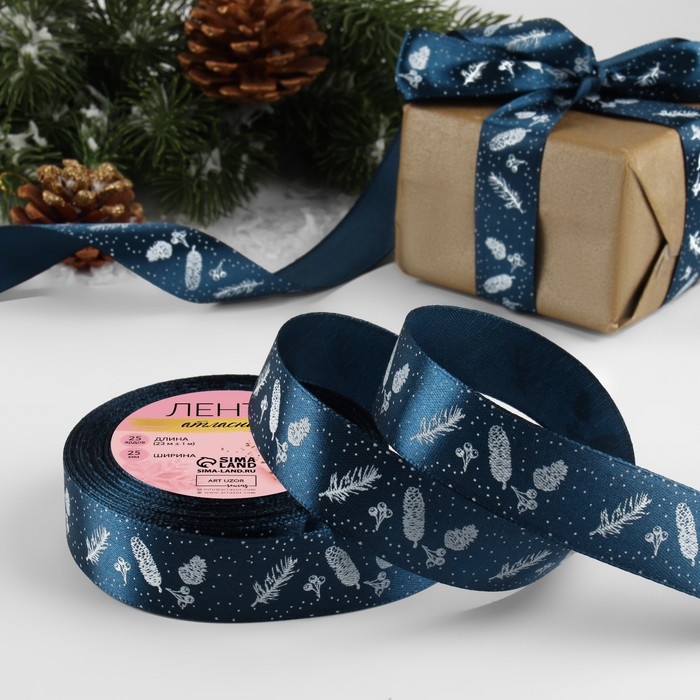 Новый год! Лента атласная «Шишки и веточки», 25 мм, 23 ± 1 м, цвет тёмно-синий №38
