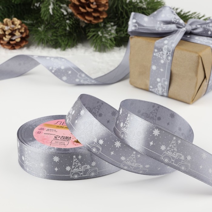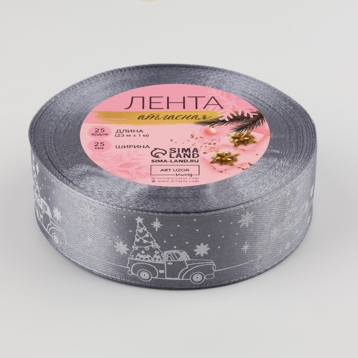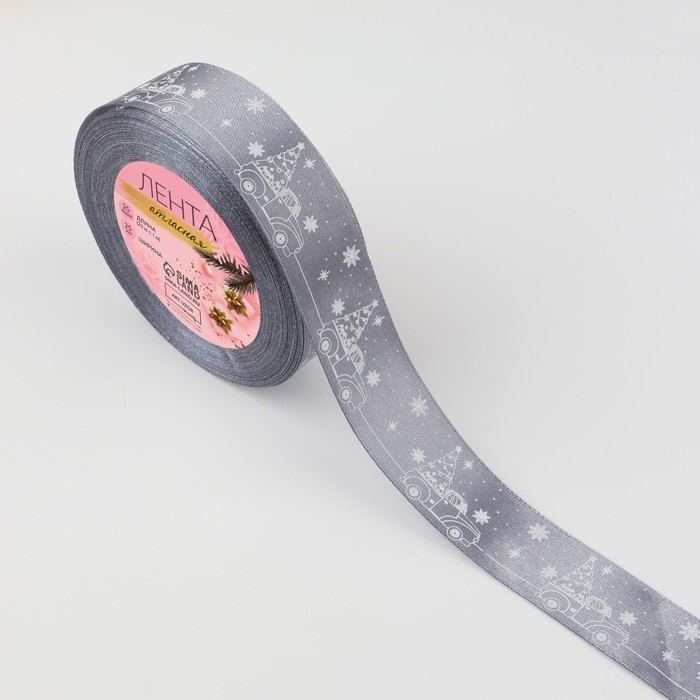 Новый год! Лента атласная «Машина с ёлкой», 25 мм, 23 ± 1 м, цвет тёмно-серый №189