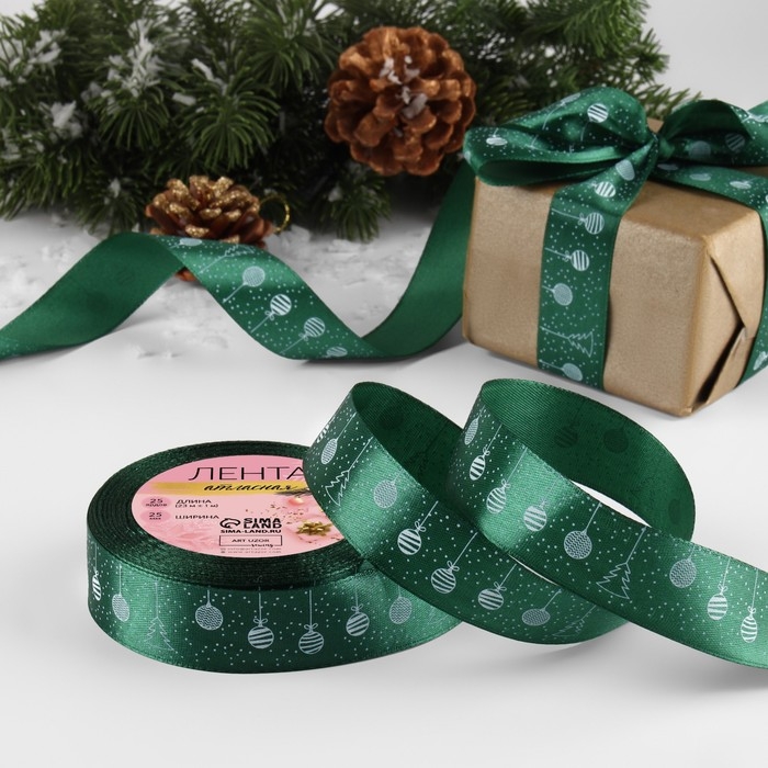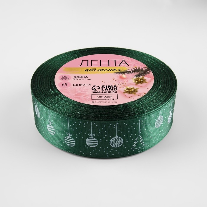 Новый год! Лента атласная «Ёлочные игрушки», 25 мм, 23 ± 1 м, цвет тёмно-зелёный №49