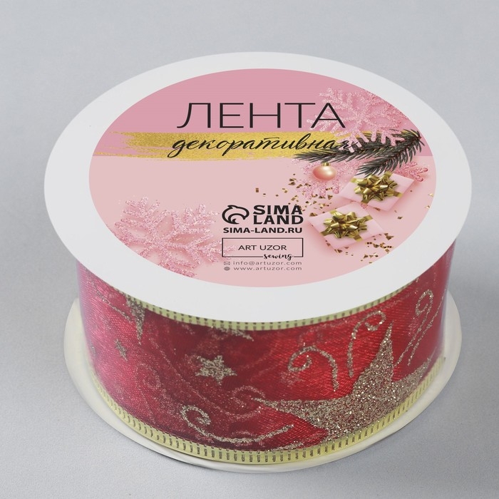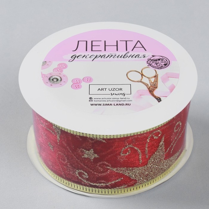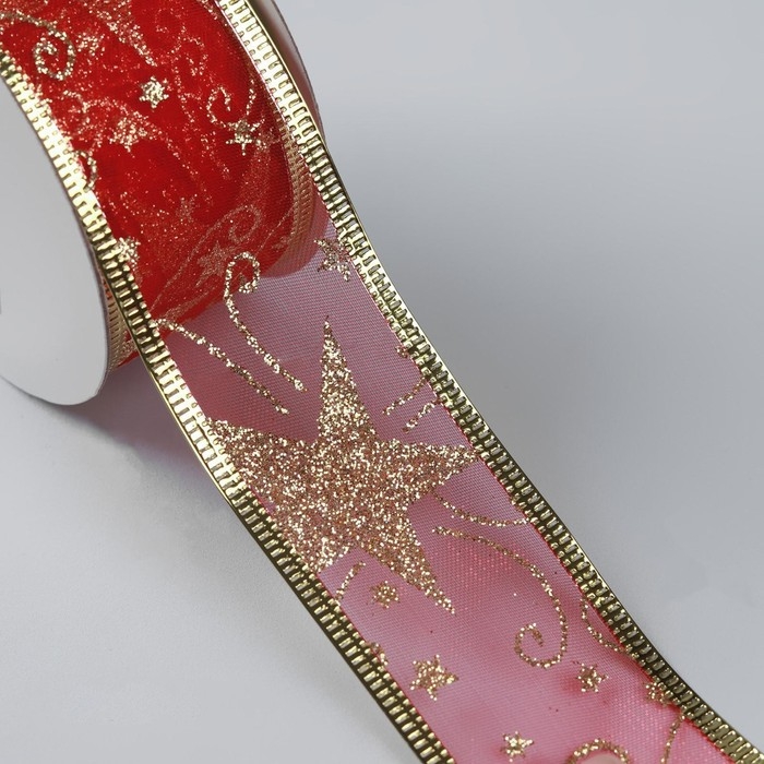 Новый год! Лента капроновая с металлической нитью «Звёзды и вьюнки», 38 мм × 2,7 ± 0,5 м, цвет красный/золотой