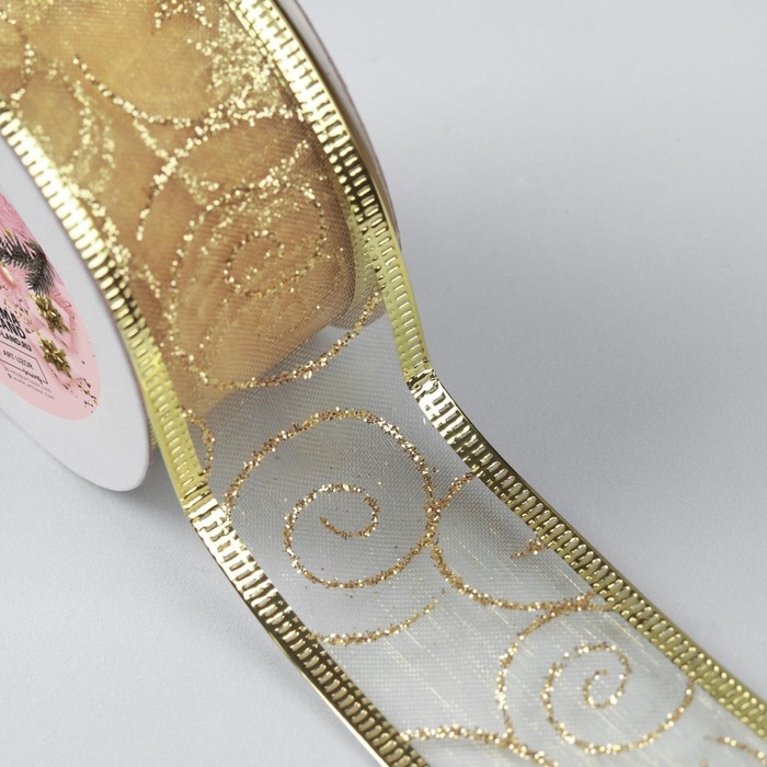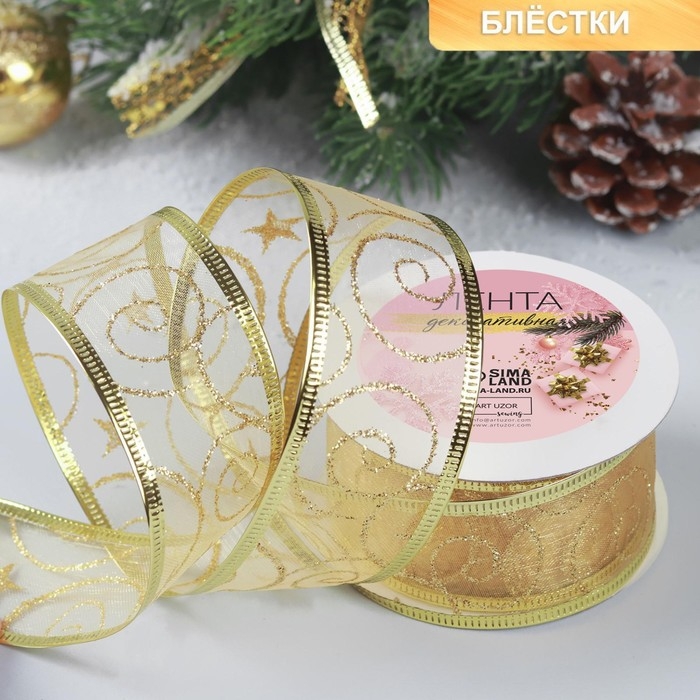 Новый год! Лента капроновая с металлической нитью «Вензеля», 38 мм × 2,7 ± 0,5 м, цвет золотой
