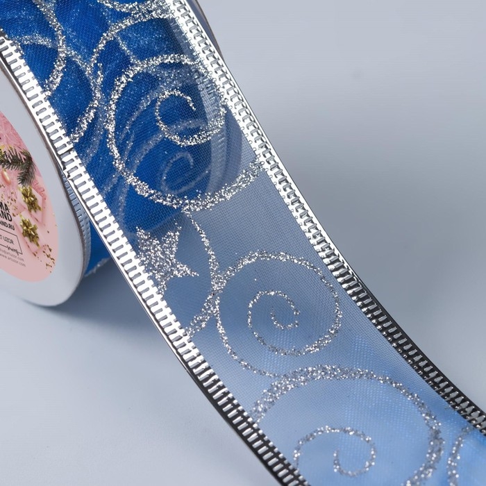 Новый год! Лента капроновая с металлической нитью «Вензеля», 38 мм × 2,7 ± 0,5 м, цвет синий/серебряный