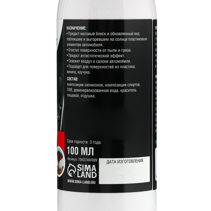 - Придаст матовый блеск и обновлённый вид поблекшим и выгоревшим на солнце пластиковым элементам автомобиля.