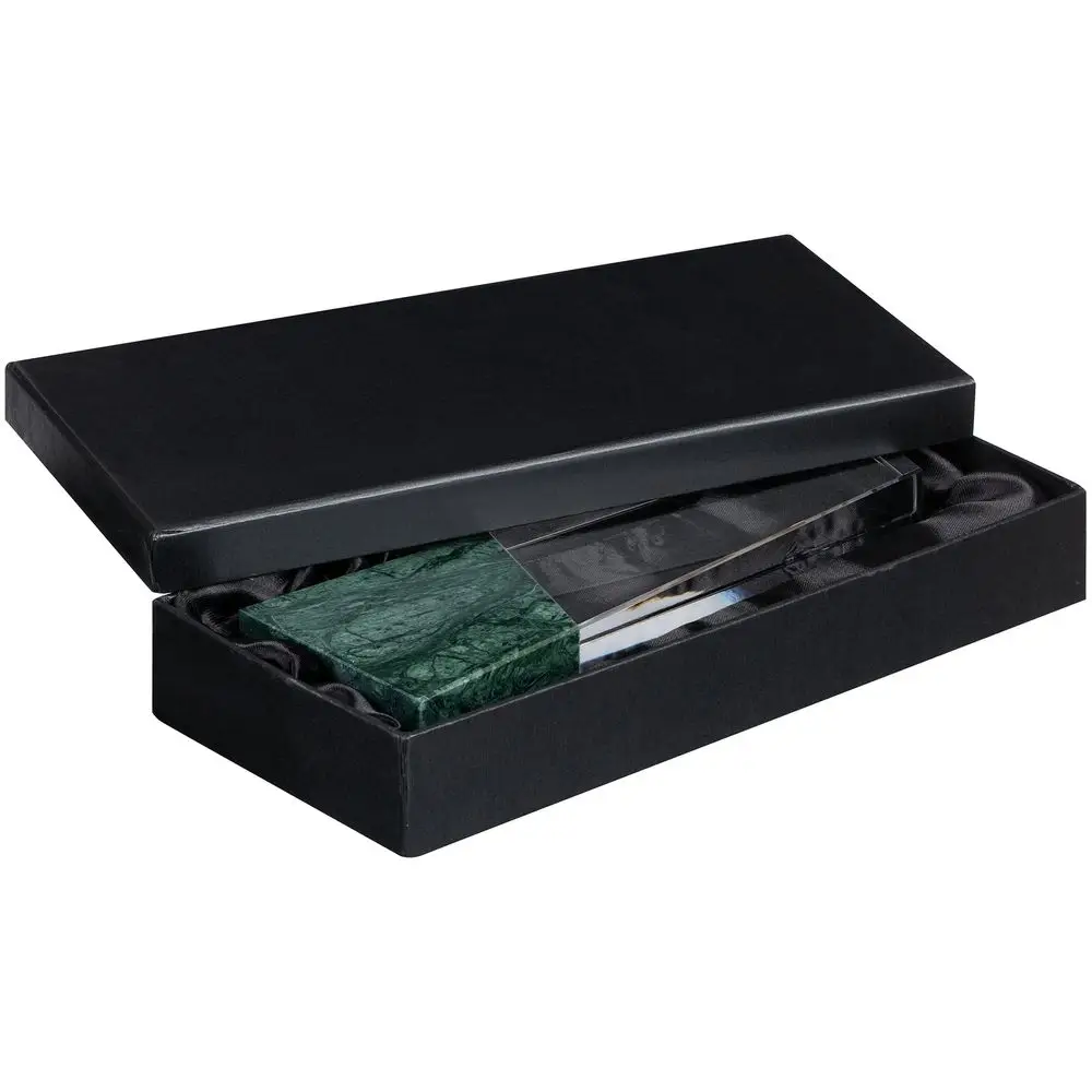 На основании из серпентина закреплен блок из стекла К9, в основе которого лежит оптическое боросиликатное стекло. Эту марку стекла отличает низкий процент посторонних включений, высокий показатель преломления и высокая прозрачность — идеальные качества для изготовления наград премиального уровня.