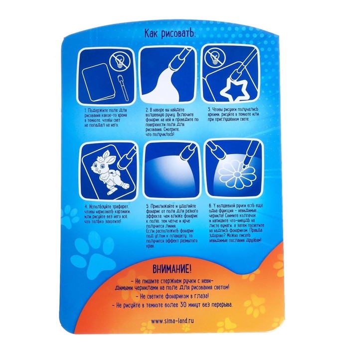 Для рисования используйте трафарет или изображайте всё, что подскажет ваша фантазия! Постепенно следы от фонарика будут затухать. Вы можете подождать, пока они исчезнут полностью (около 30 минут) или творить поверх старых рисунков — каждый новый слой будет ярче предыдущего.