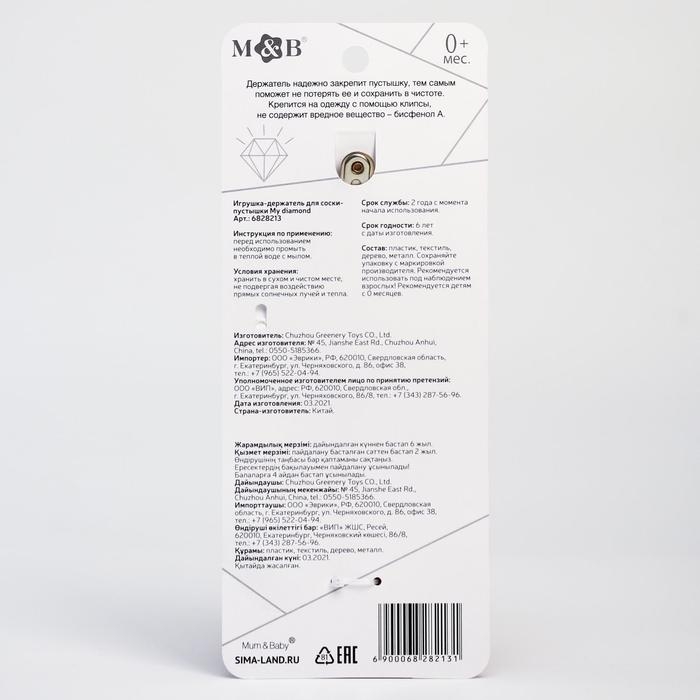 Изделие фиксируется на одежде ребёнка. На конце цепочки есть карабин, который зацепляется за кольцо пустышки. Надёжное крепление убережёт вещь от падения на пол, если малютка случайно выронит её изо рта.