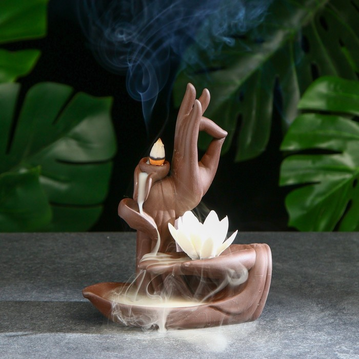 В набор входит 10 конусов и фигурная керамическая подставка. Когда благовония тлеют, дым стелется по основанию фигуры, создавая эффект водопада. Пепел остаётся на подставке и не падает на мебель.