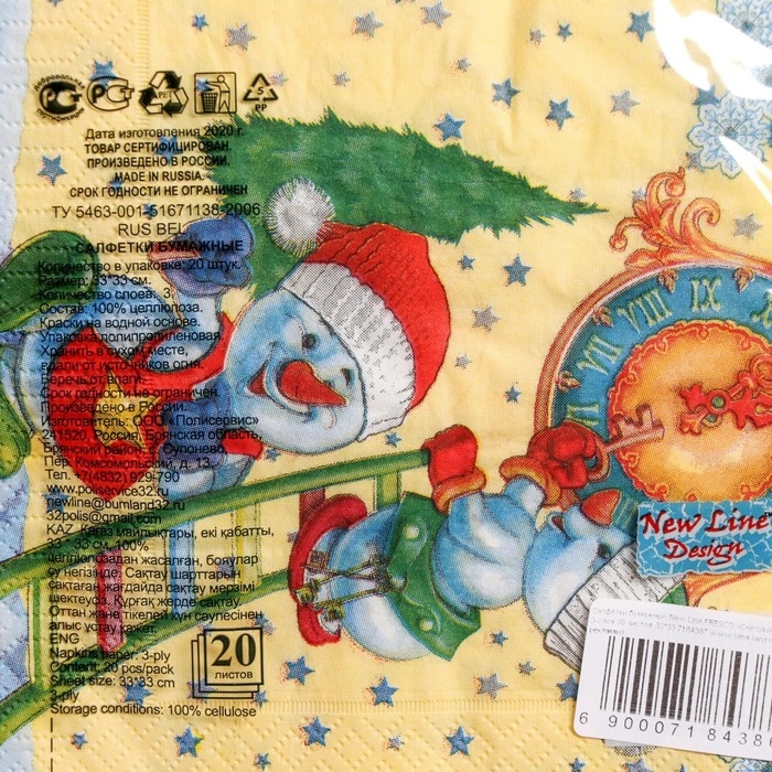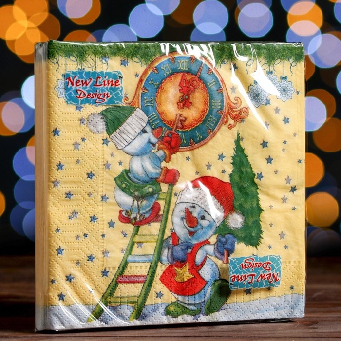 Новый год. Салфетки бумажные New Line Design «Снеговички-Часовички», 33х33 см, 3 слоя 20 листов