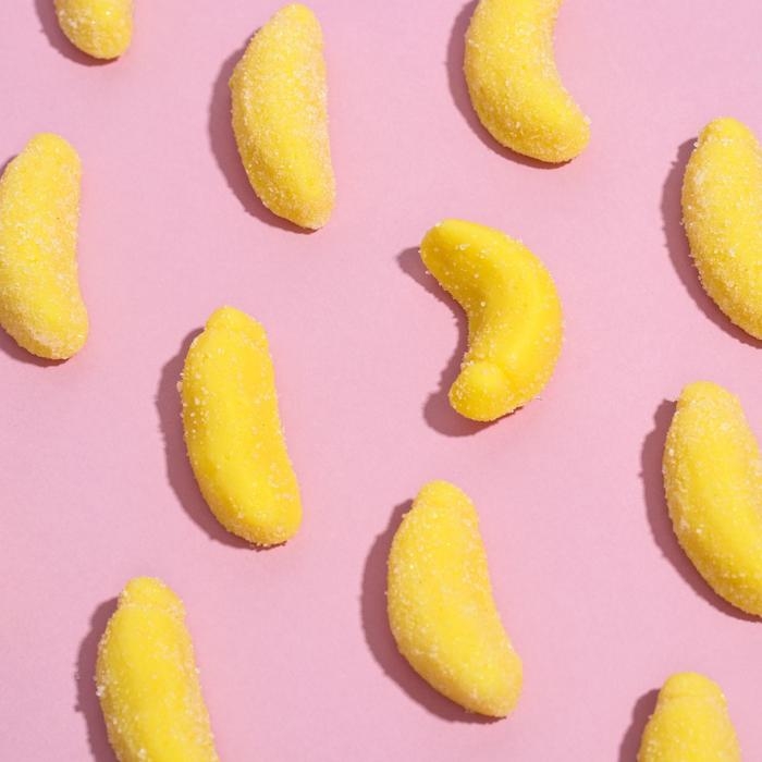 Состав: глюкозный сироп, сахар, агент желирующий – желатин, регулятор кислотности – лимонная кислота (Е330), ароматизатор «Банан», красители пищевые: тартразин (E102), диоксид титана (Е171), глазирователь: растительное масло, карнаубский воск.