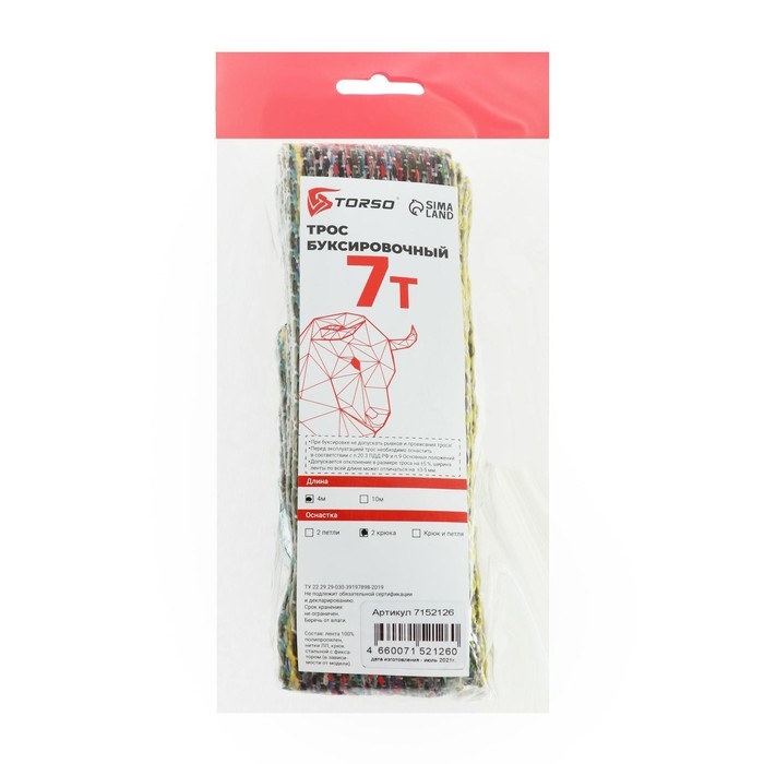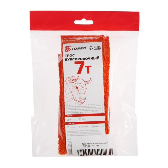 Трос-лента буксировочный TORSO, 7 т, 4 м, 2 крюка