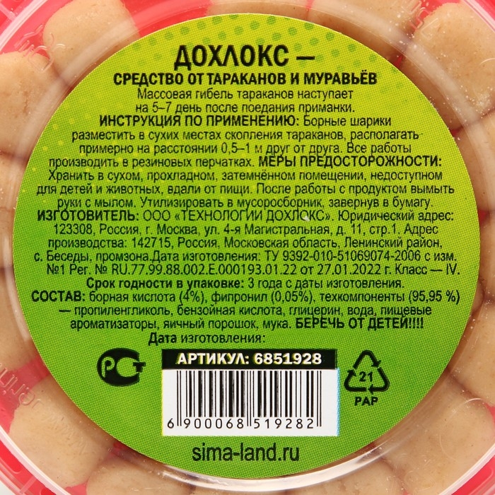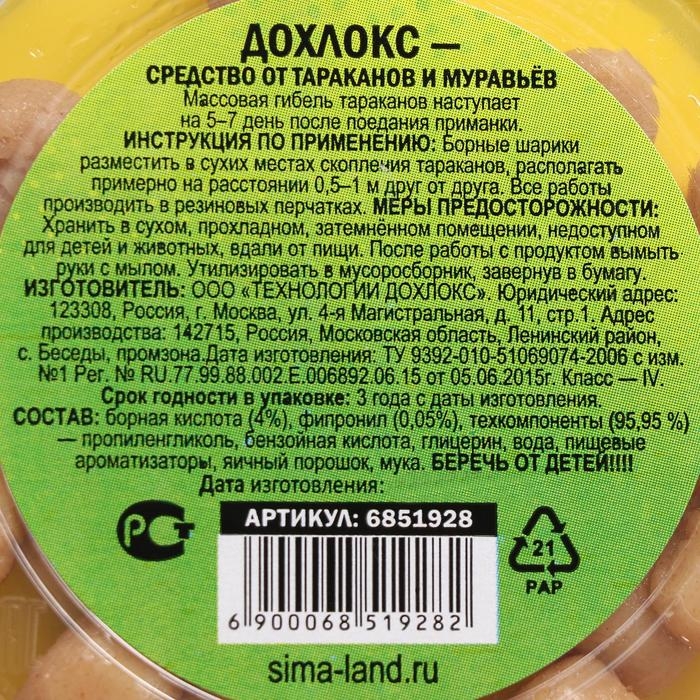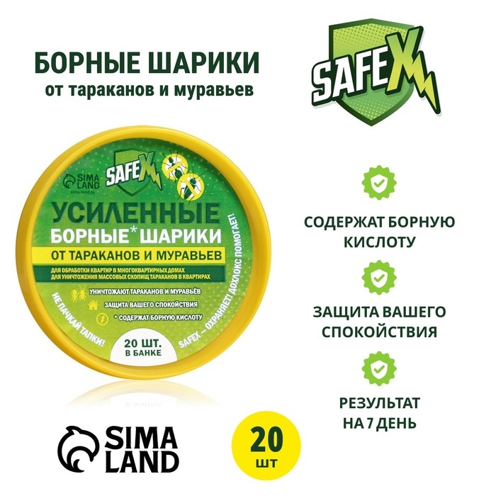 Борные шарики от тараканов усиленные "SAFEX" – для уничтожения скопления тараканов в квартирах.Они содержат в своем составе борную кислоту, которая является ядом для насекомых.При использовании борных шариков массовая гибель тараканов наступает через 5-7 суток. Насекомые поедают отравленную приманку, заражаются ядом, а затем отравляют им своих сородичей, что приводит к цепной реакции отравлений по типу эпидемической.Каждая банка содержит 20 шариков, которые легко располагаются в различных уголках квартиры или дома. Они не только уничтожают уже существующих тараканов, но и предотвращают появление новых.Способ применения: вскрыть упаковку. Извлечь борные шарики и разместить в сухих местах передвижения и скопления тараканов. Шарики требует располагать на расстоянии 0,5-1 метр друг от друга. Все работы рекомендовано производить в резиновых перчатках.Меры предосторожности: хранить в сухом, прохладном, затемненном помещении, недоступном для детей и домашних животных, вдали от пищи. После работы с продуктом вымыть руки с мылом. При случайном попадании в глаза или на кожу смыть большим количеством воды.Срок годности: 3 года.