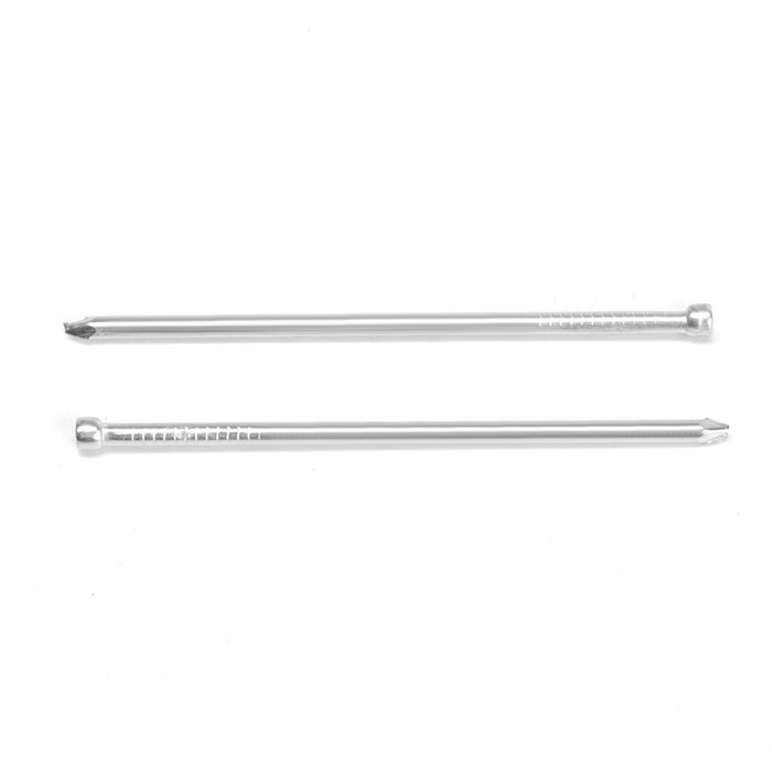 Изделие представляет собой цилиндрический стержень с маленькой высокой головкой. Благодаря небольшому сечению такой гвоздь легко входит в дерево. Диаметр головки незначительно превышает диаметр стержня, и после забивания она сливается с поверхностью материала.