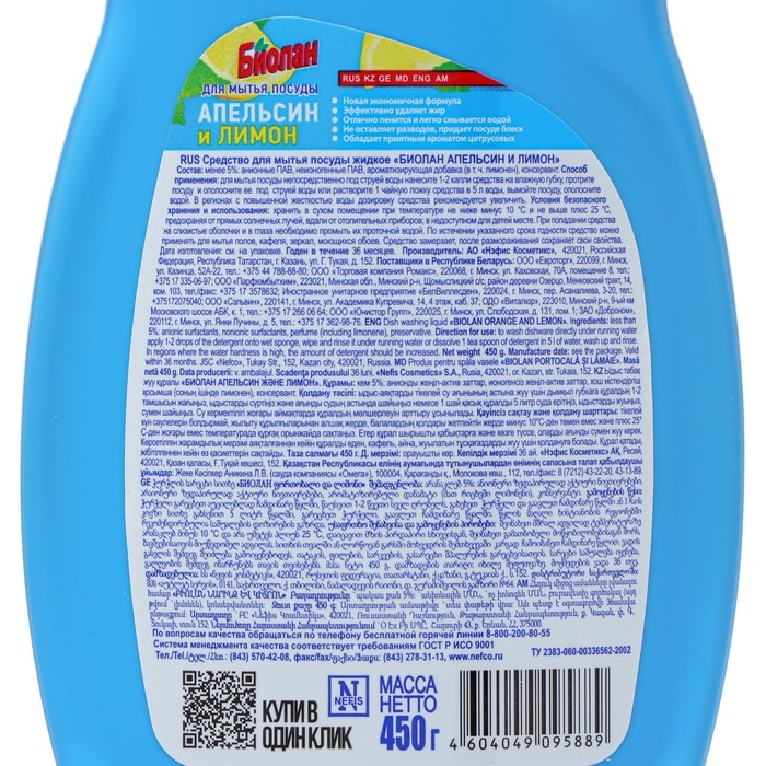 Средство для мытья посуды «Биолан» апельсин-лимон, 450 мл