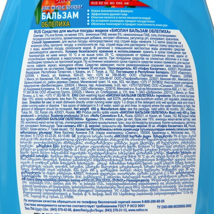 Состав: вода, <5% анионное ПАВ, <5% неионогенные ПАВ, соль этилендиаминтетраукусной кислоты, ароматизирующая добавка, экстракт облепихи, регулятор рН, консервант, красители.