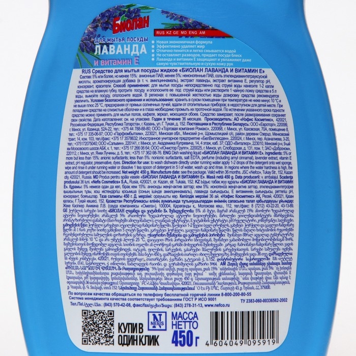 Средство для мытья посуды "Биолан - Лаванда/Витамин Е", 450 мл