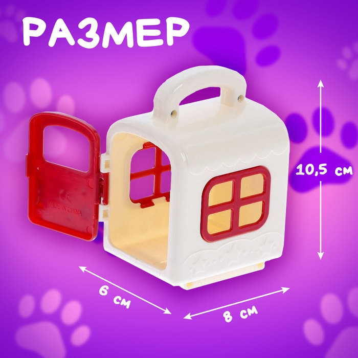 У питомца есть свой домик, миска с едой, бутылочка.
