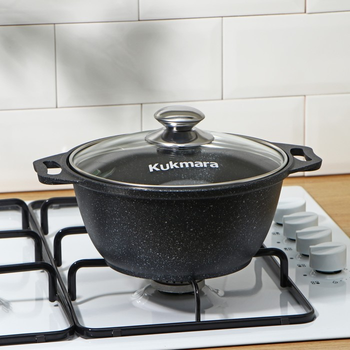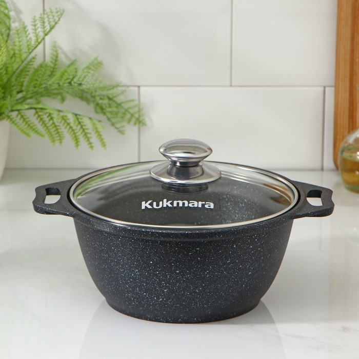 Кастрюля Kukmara сделана из литого алюминия. Имеет инновационное антипригарное мраморное покрытие на водной основе, которое изготовлено по немецкой технологии (Weilburger Coatings GmbH) и усилено сверхтвёрдыми частицами минералов.