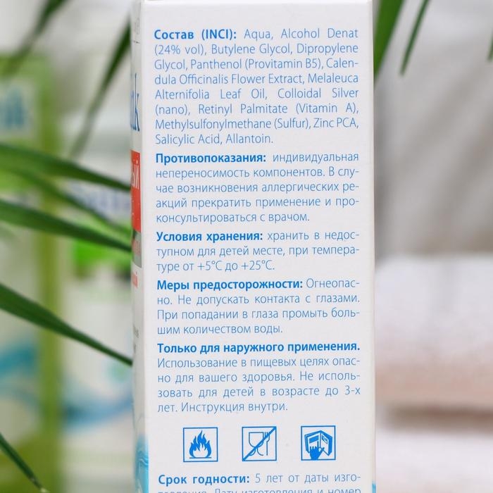 Витамин А восстанавливает и стимулирует обновление клеток кожи. Спирт (24 %) высокой степени очистки устраняет вредные бактерии, предотвращая развитие воспаления, растворяет остатки макияжа и загрязнений на коже, подсушивает прыщики и борется с воспалением.