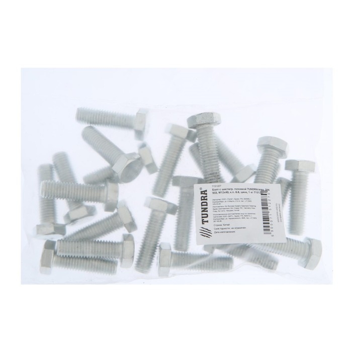Болт ТУНДРА, оцинкованный, DIN 933, класс прочности 8.8, М12х60 мм, 5 кг