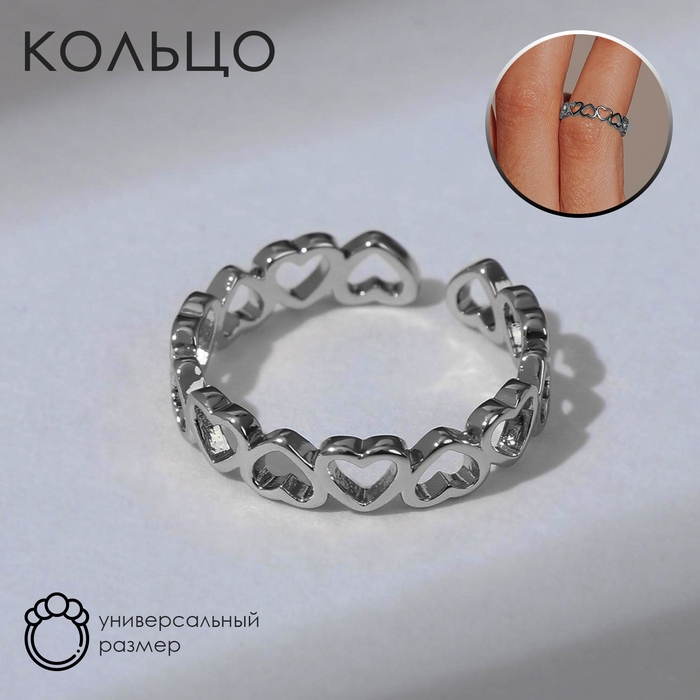 Кольцо «Цепь из сердечек», цвет серебро, безразмерное