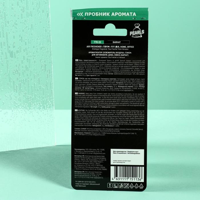 В подвесном ароматизаторе Tensy Бархат чувствуются нотки терпкого бергамота, пряного кардамона, игривых цитрусов, освежающей карамболы, смолянистого белого кедра, а также изысканного шафрана, жгучего перца и волнующего мускуса. Для создания этой весенне-летней свежей ароматической композиции используются только высококачественные парфюмерные отдушки из Франции.